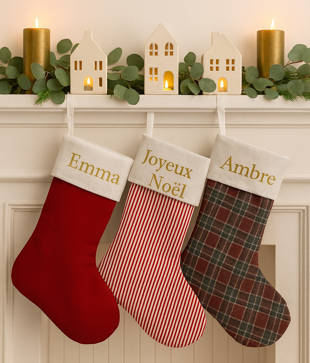 Trois coloris sont disponibles afin que chaque décoration s’accorde parfaitement à votre univers. Que vous préfériez un style traditionnel ou moderne, cette chaussette de Noël personnalisable s’intègre facilement et complète vos autres décorations festives.