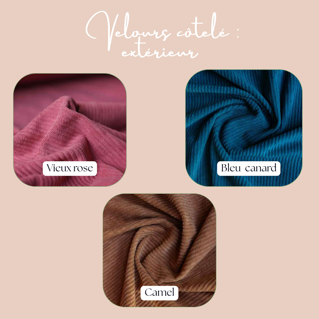 Velours Bleu Marine, Velours Moutarde, Velours Rose, Velours Vert Sapin, Velours bleu canard, Velours Bleu clair, Velours camel, Velours Marron, Velours Rose fushia, Velours Vert jade, Velours vieux rose, Velours violet lila